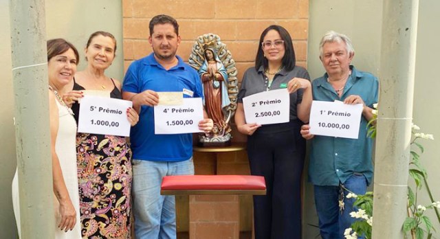 O Instituto Missão Guadalupe entregou os prêmios do 1º sorteio da campanha, realizado no último dia 4. Os ganhadores são: 586 – João Dias Silva Filho (R$ 10 mil); 385 – Riber e Cia. (R$ 2,5 mil); 803 – Valdir Peres (R$ 1,5 mil) e 621 – Maria Emília A. Junqueira (R$ 1 mil). O 3º prêmio (R$ 2.100,00) saiu para carnê não adquirido (526) que foi sorteado novamente ontem, 11/10.