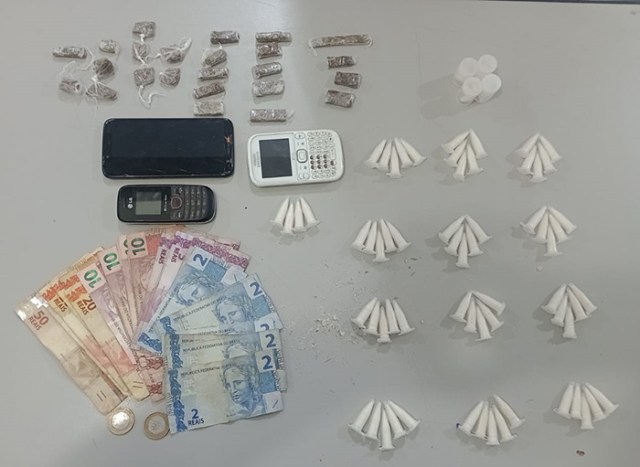 A PM prendeu dois traficantes, um homem e uma mulher, flagrados vendendo drogas na Rua 1 do bairro Colina F na noite do dia 12 para uma terceira pessoa, que foi liberada após os procedimentos de praxe. Um terceiro envolvido conseguiu fugir. Ao todo, foram tiradas de circulação 68 cápsulas de cocaína (13,2g), 24 papelotes de maconha (45g) e apreendido R$ 333,00 em dinheiro. Os traficantes, de 20 e 21 anos, foram presos em flagrante e encaminhados para a cadeia de Colina e Bebedouro.